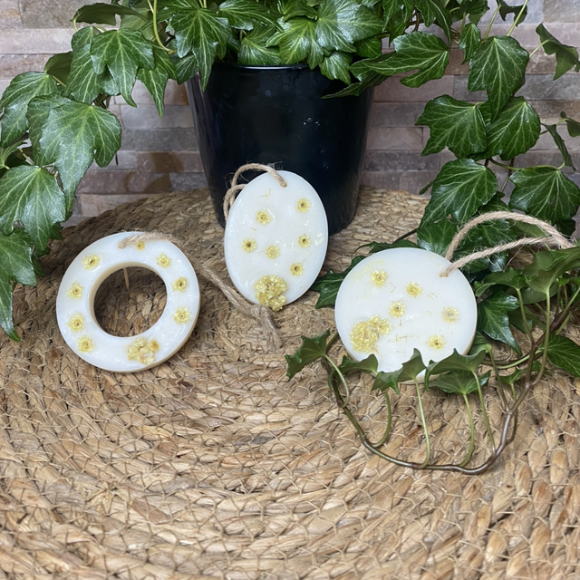 Suspension parfumée fleurie à la main avec de délicates petites fleurs séchées.